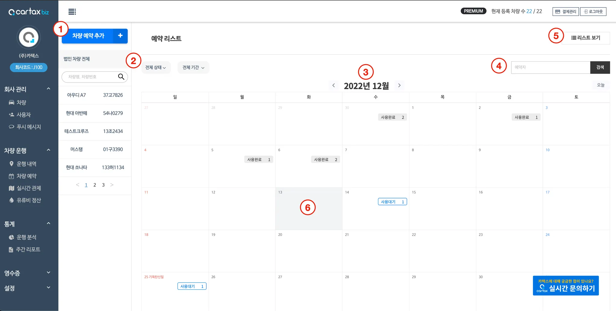 1. 예약 리스트 | 선택일의 예약 현황을 확인합니다 (캘린터보기만 지원) |