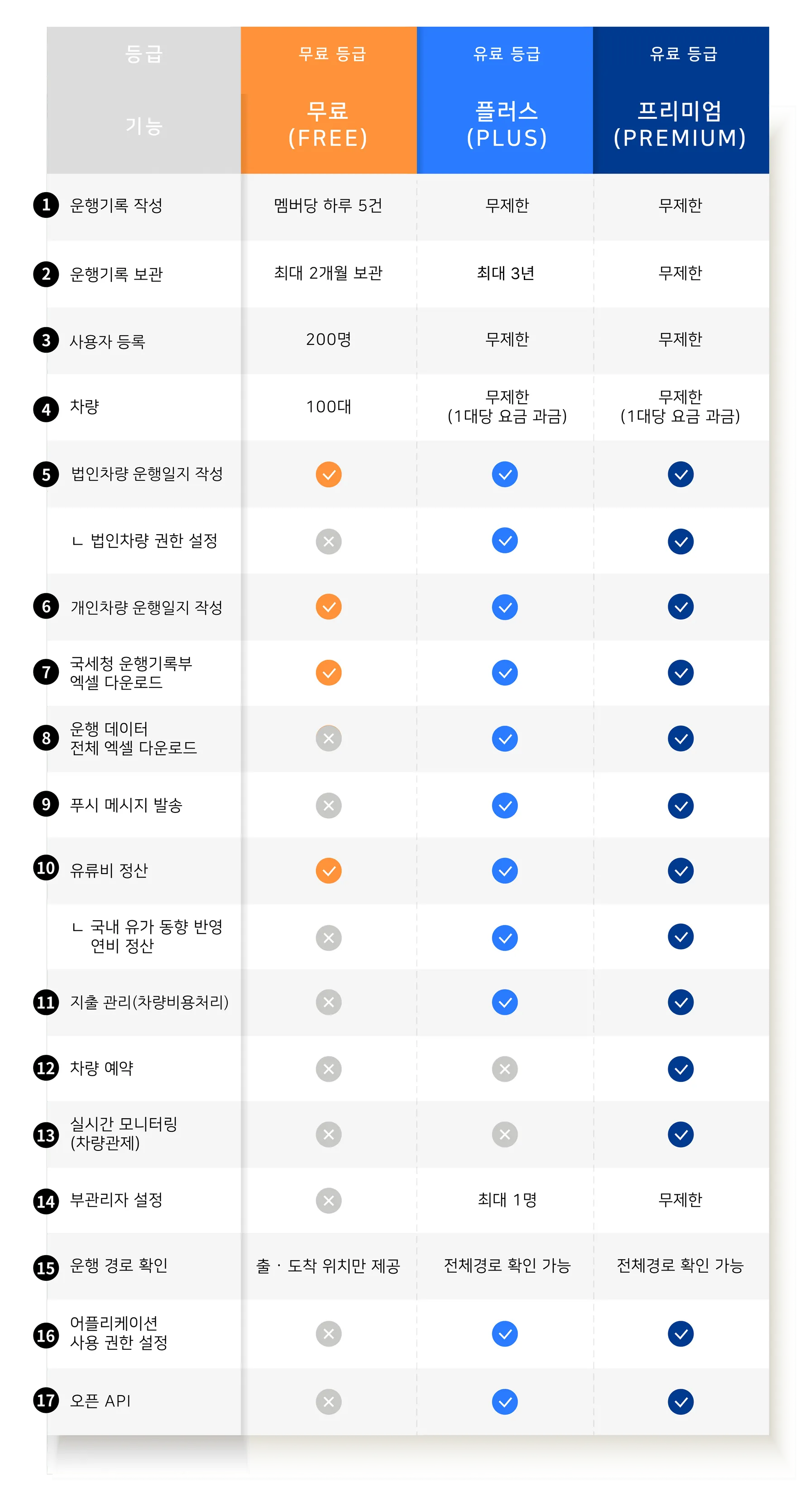 사용자(운전자) 등록은 무료 등급에서 최대 200명까지 등록 가능하며, 유료 등급에서는 무제한 등록 가능합니다.