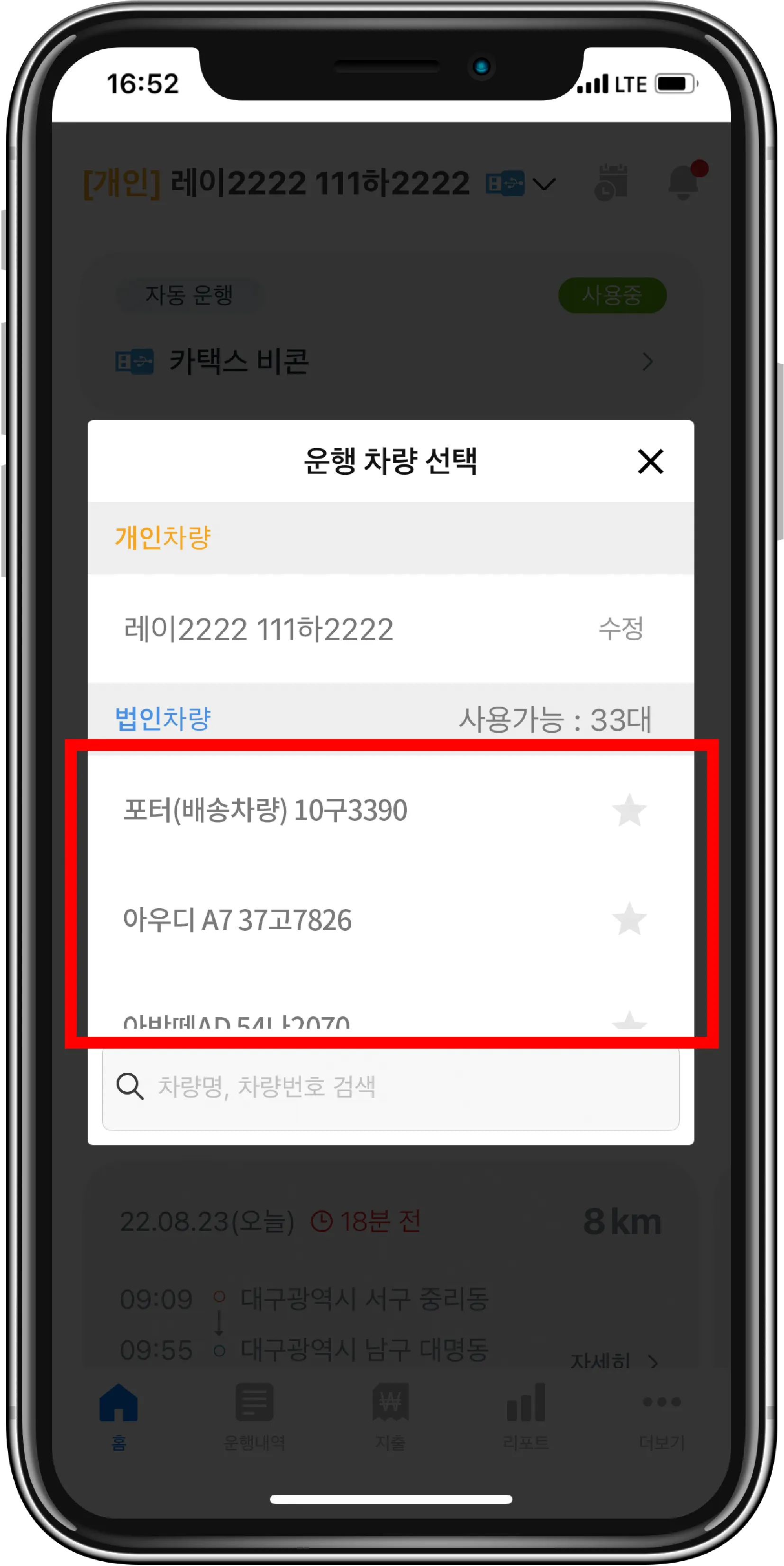 차량을 공용으로 사용할 경우 법인차량으로 등록하고 운행기록 및 운행일지 작성이 가능합니다. 운행 시간 순서대로 자동으로 운전자 구분하여 운행기록이 관리됩니다.