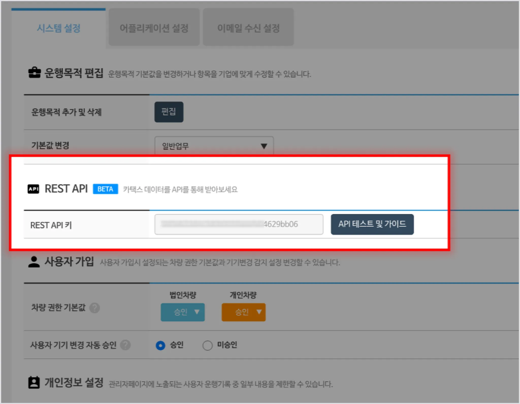 좌측 메뉴 설정 → 시스템 설정 → REST API