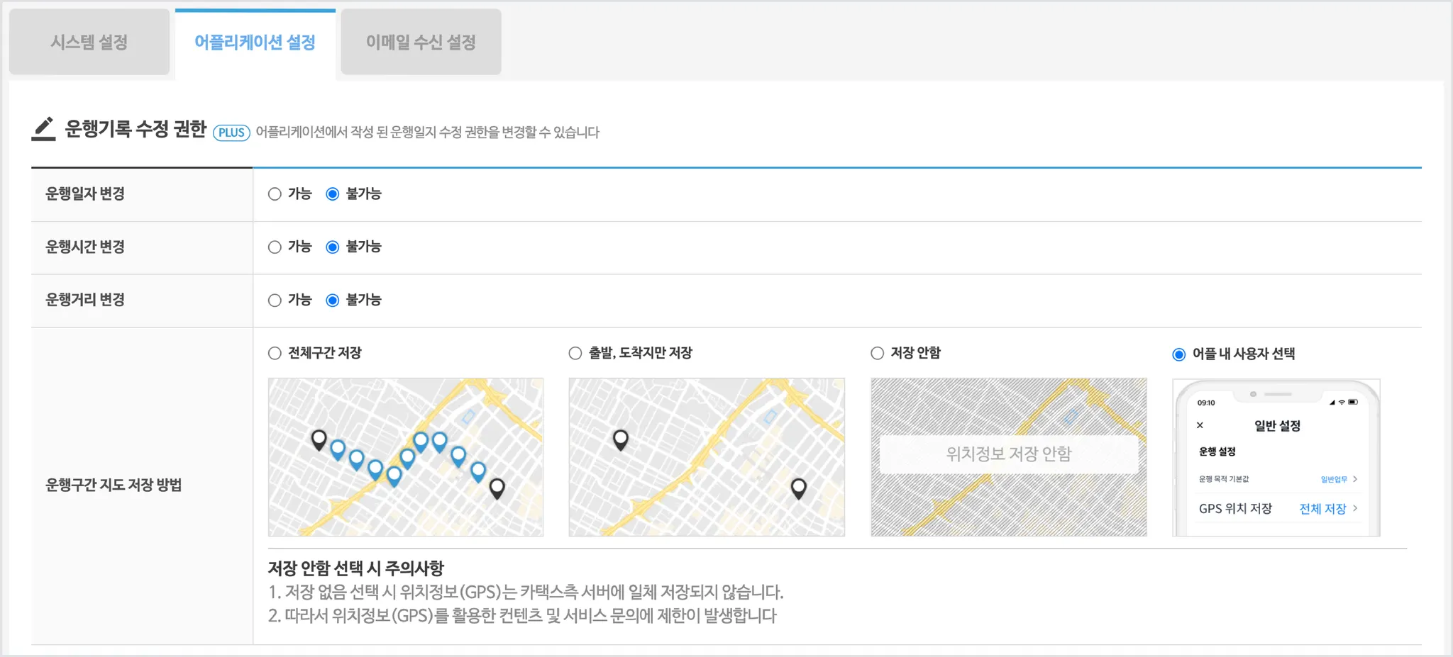 어플리케이션에서 작성한 운행기록 수정 권한과 지도 저장 방법을 관리할 수 있습니다.