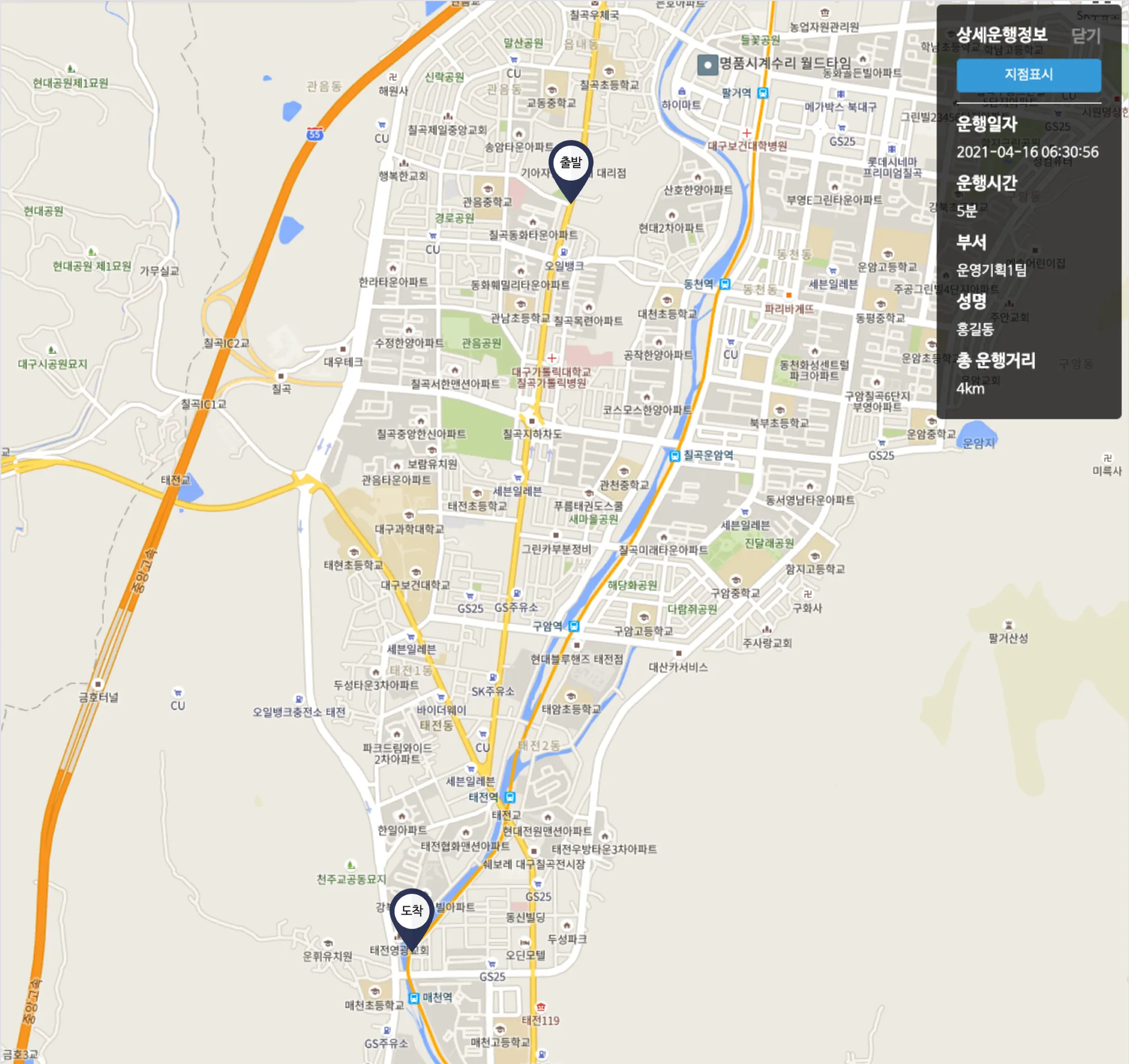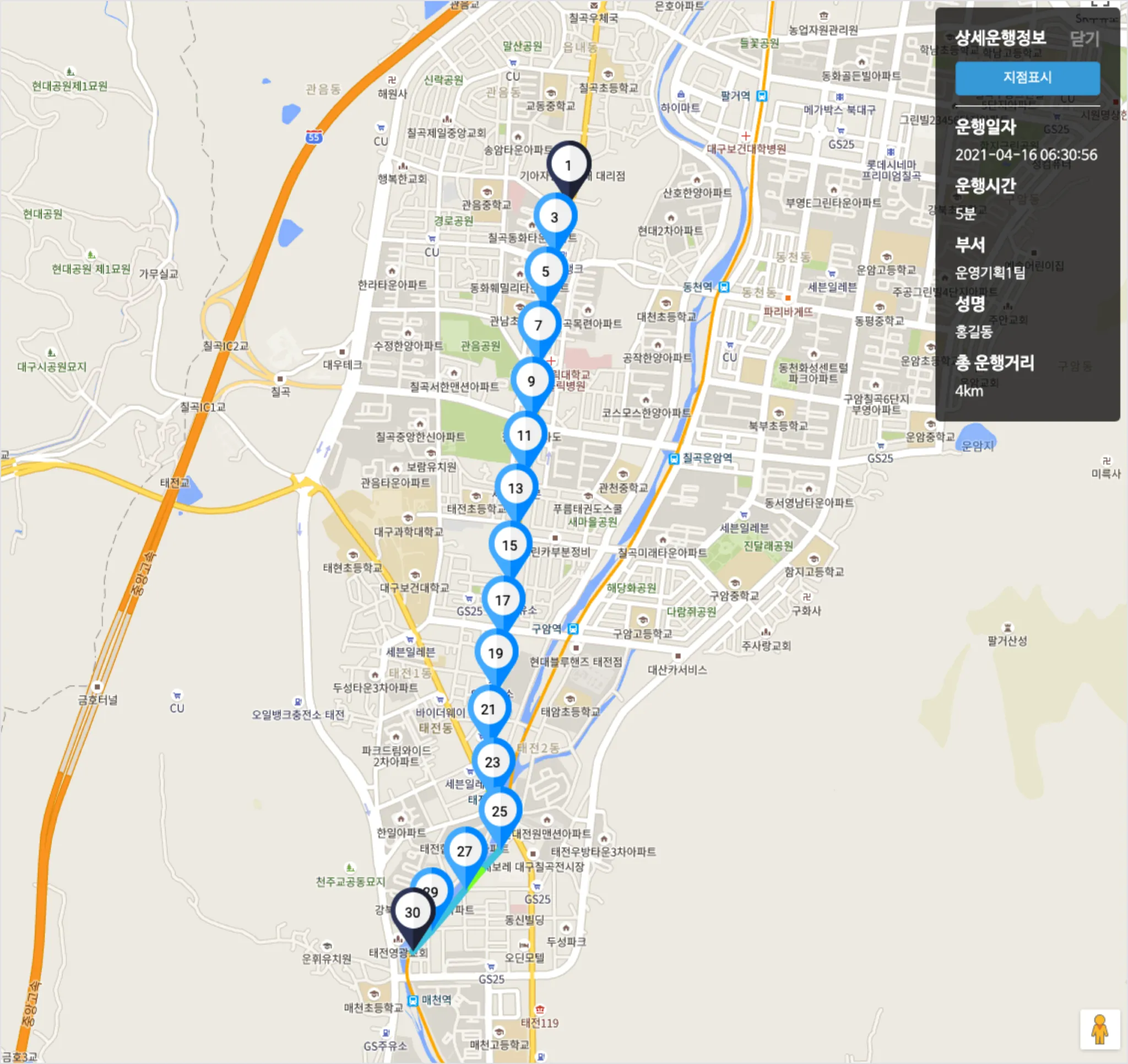 운행기록 작성 완료 후 해당 기록의 운행경로 표시방법입니다.