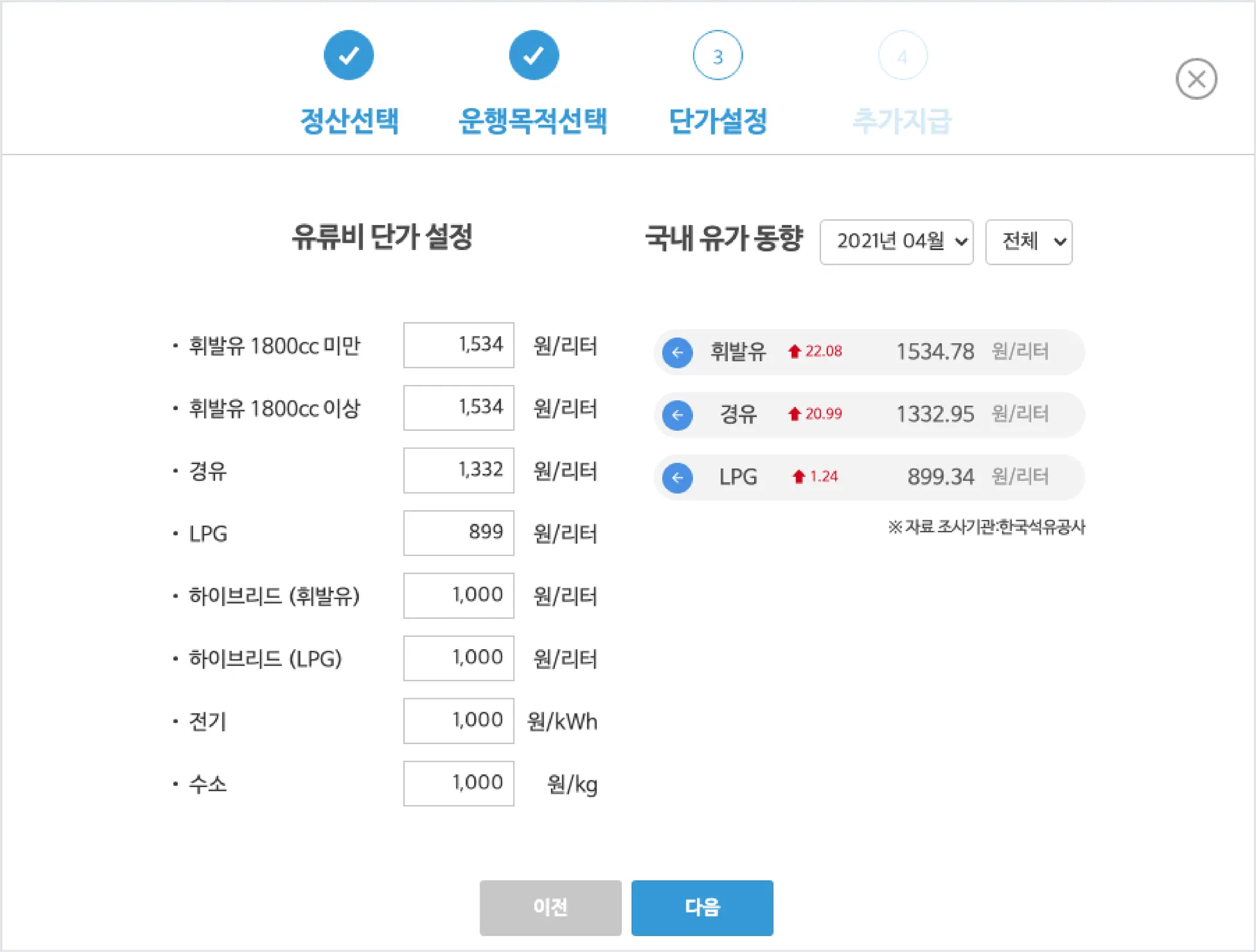 각 차량 연비와 국내 유가 정보를 활용하여 보다 형평성 있게 유류비 지급 가능합니다.