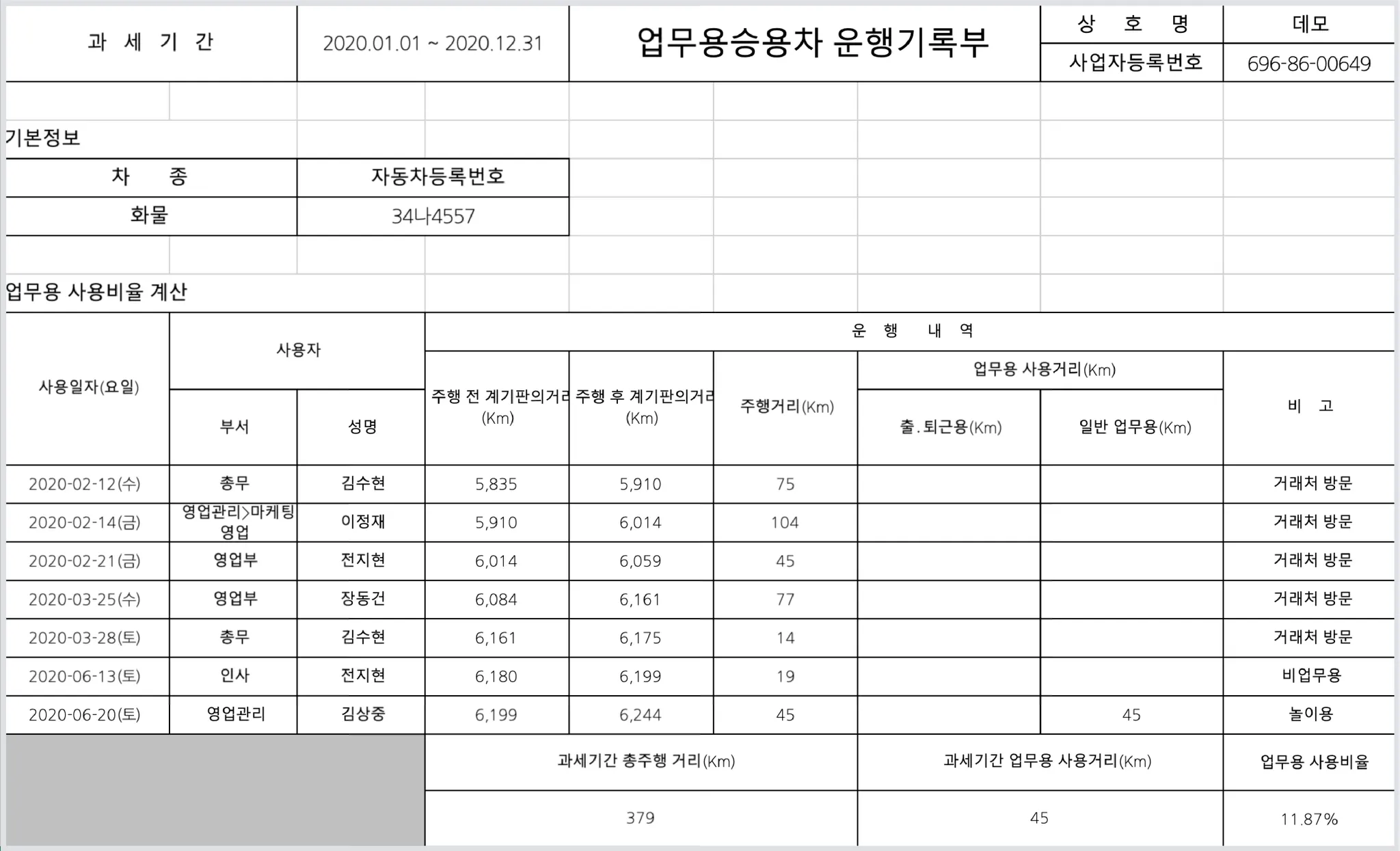 작성한 운행기록은 국세청 양식의 '업무용승용차 운행기록부' 양식의 엑셀(Excel) 파일로 바로 생성 및 다운로드할 수 있습니다.