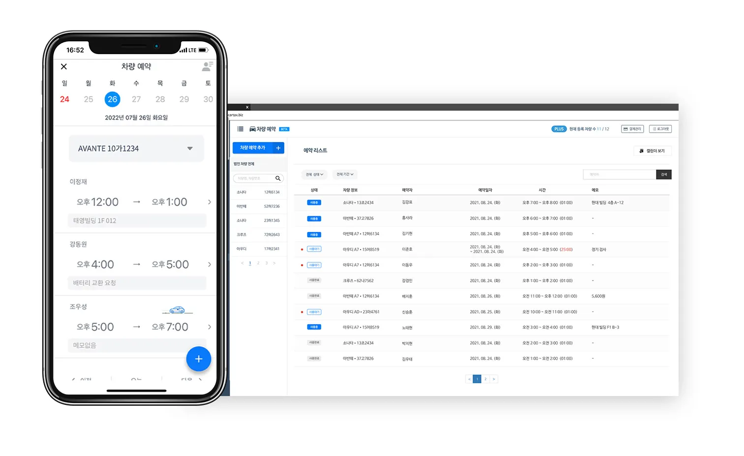 카택스 앱과 PC 웹 관리자 페이지를 통해 공유차량 사용 시, 원하는 날짜, 시간에 필요한 차량을 예약하여 사용 가능합니다.