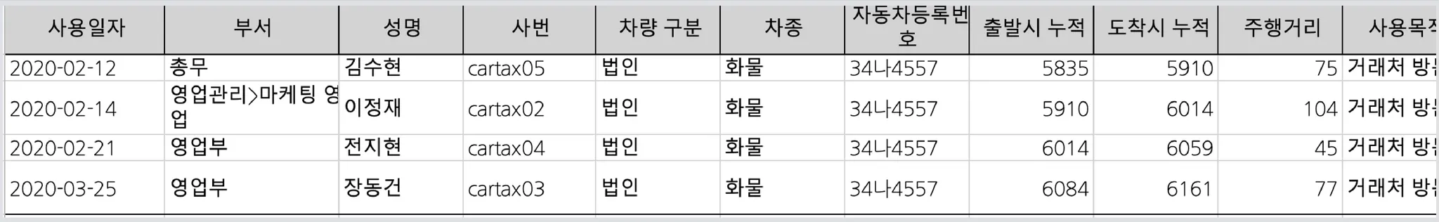 - ex) 홍길동 운전자가 A차량으로 5건 운행기록 작성시 B차량으로 추가 5건 작성 가능