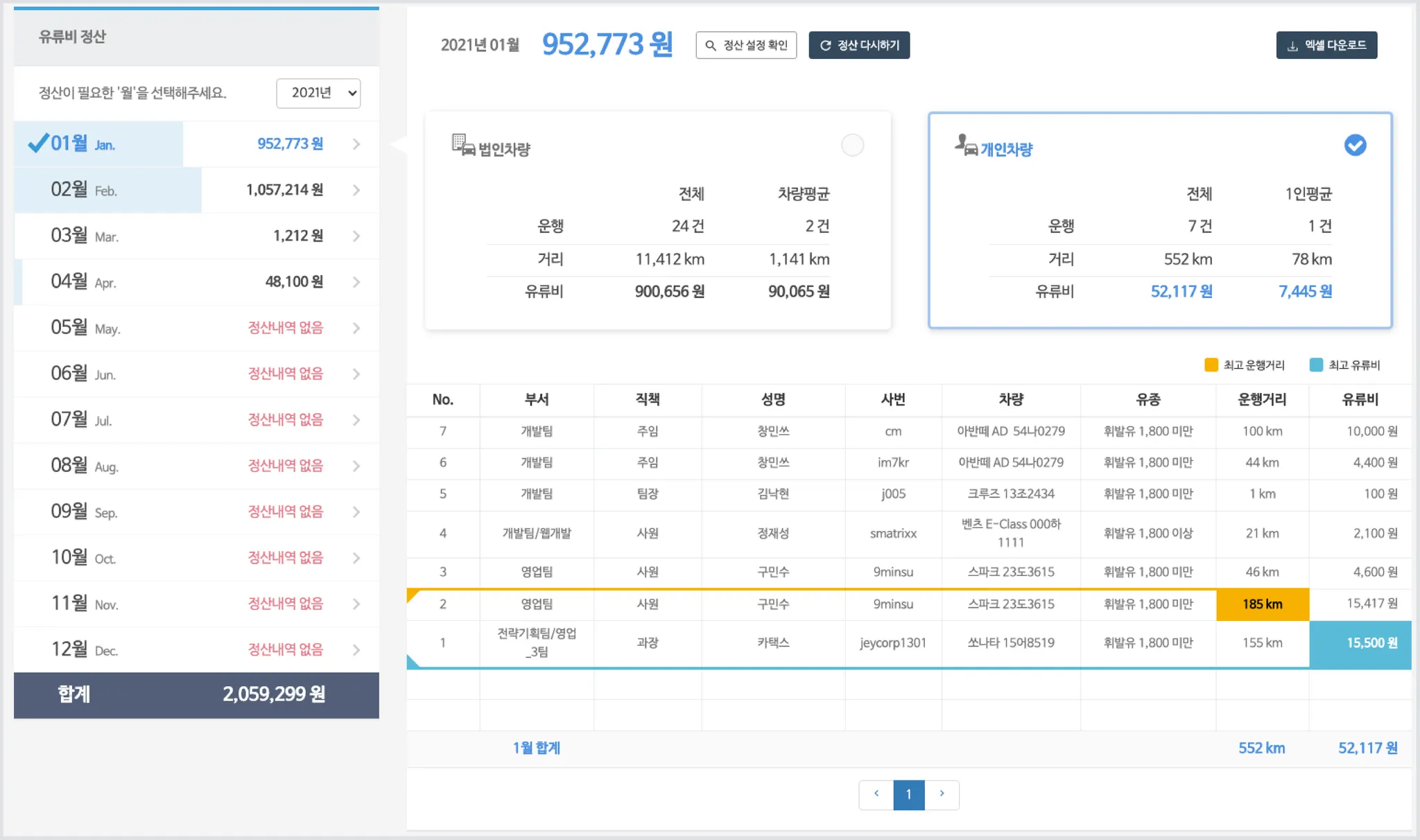 - 연비 정산 : 각 차량 연비에 맞는 유종별 단가 (ex. 13km 당 1,523원 차등 지급)