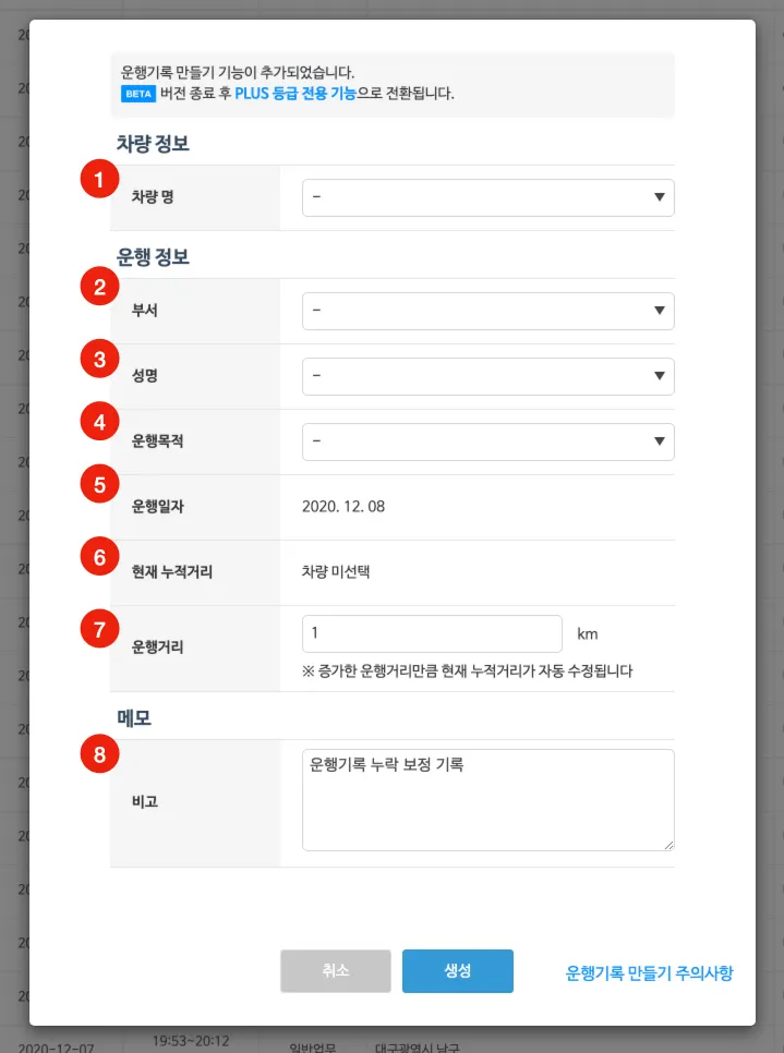 8. 메모 : (기본값) 운행 기록 누락 보정 기록 (삭제 가능)