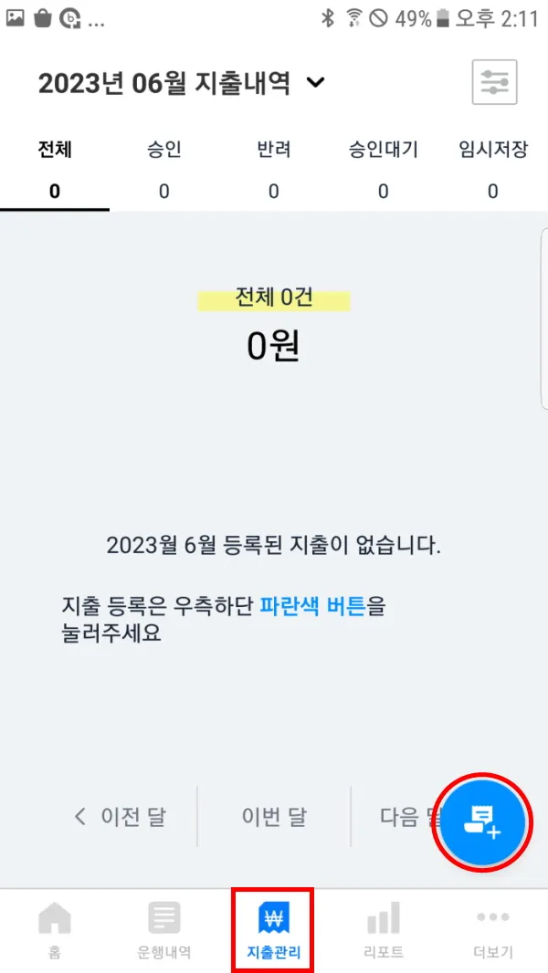 지출내역이 발생하면 앱의 [지출관리] 메뉴 우측 하단의 ‘+’추가 버튼을 탭하여 지출내역을 등록합니다.