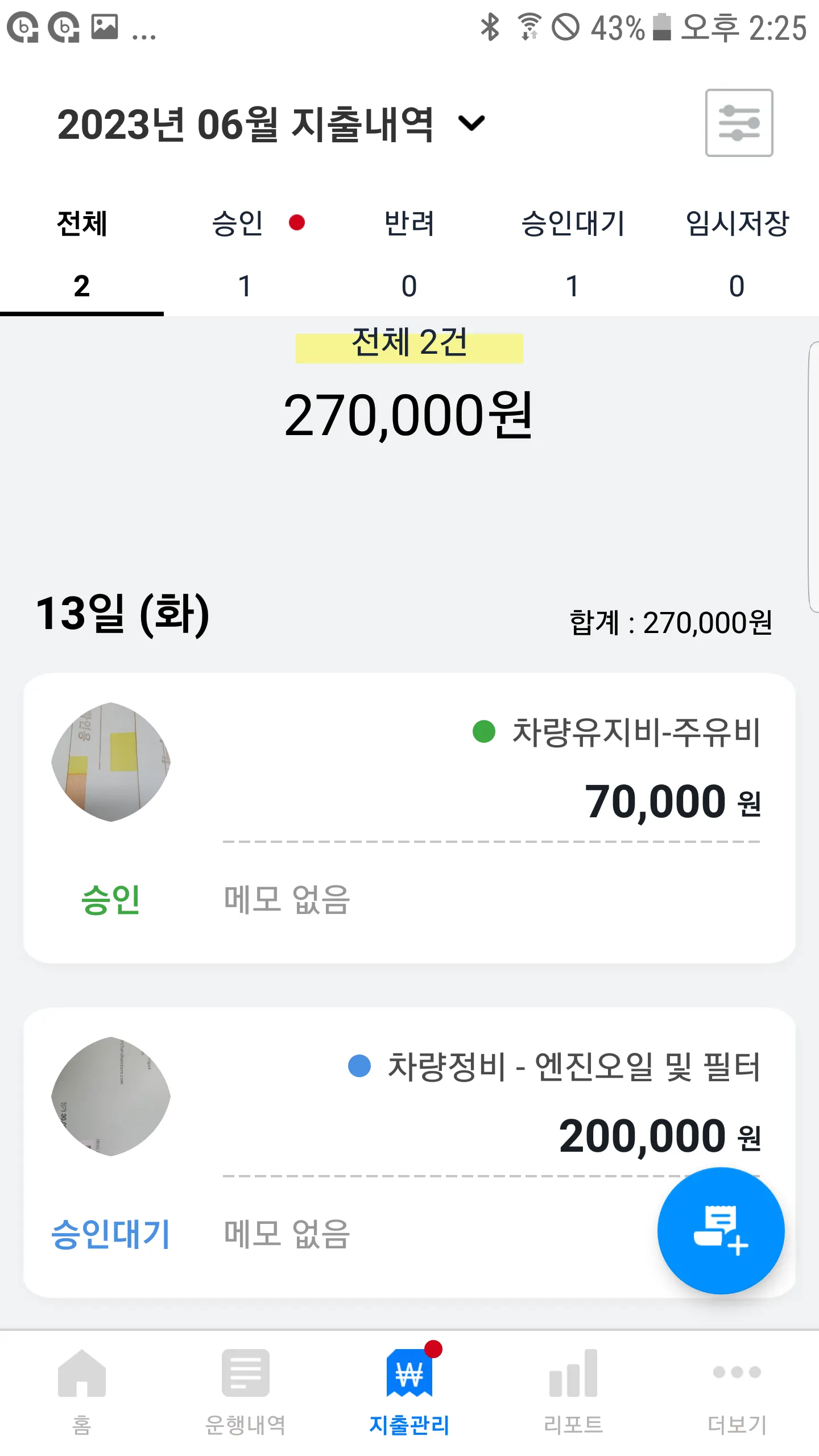 차량정비, 정기점검, 주유비, 주차비, 통행료 등 차량과 관련된 지출이 발생하는 경우 앱의 [지출관리]메뉴를 통해 지출내역을 등록합니다.
