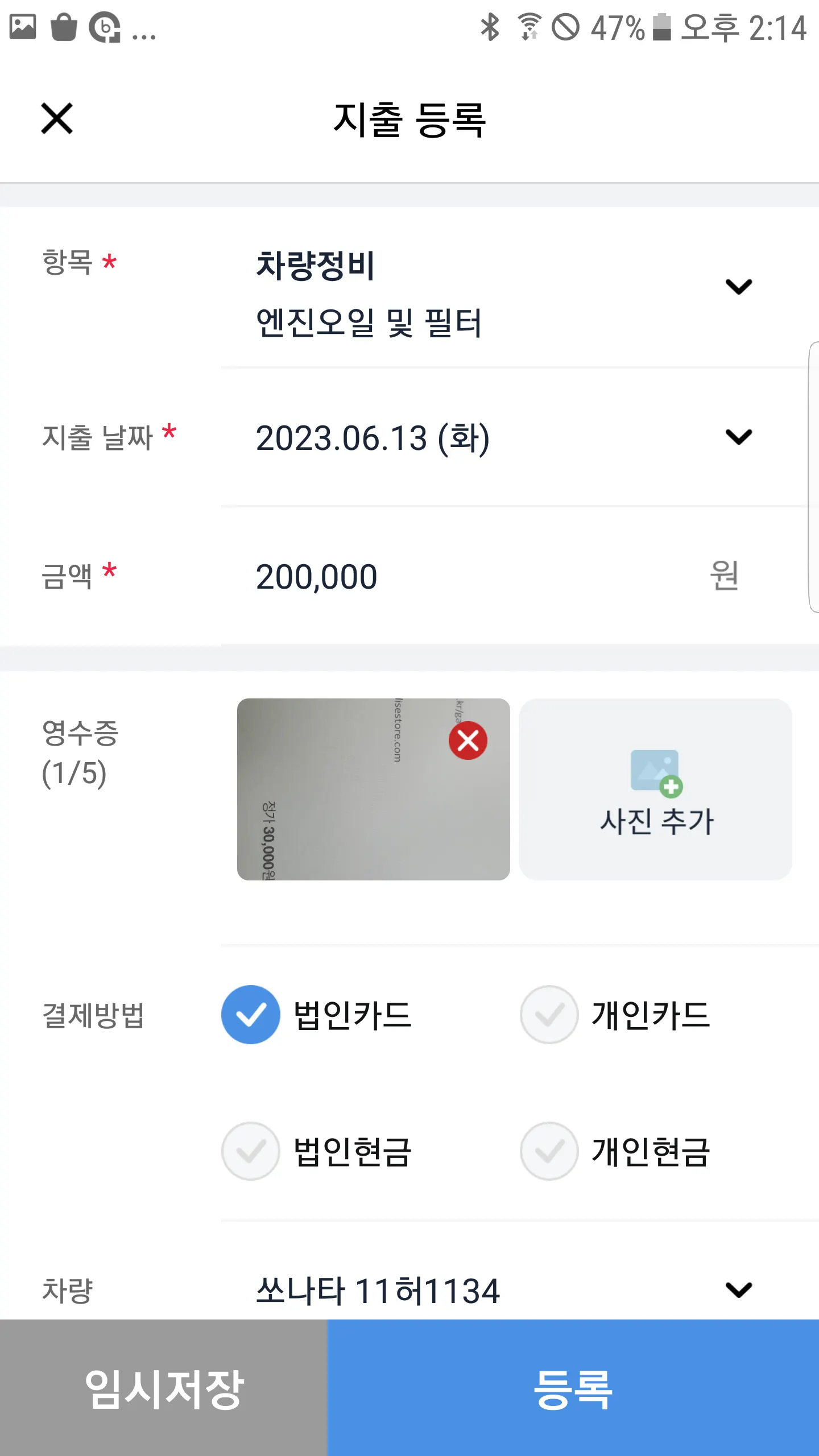 주유비(유류비), 보험료, 수선비(수리비), 통행료, 주차비 등 차량과 관련된 지출은 법인카드, 개인카드 등 결제 수단에 상관 없이 등록하도록 합니다.