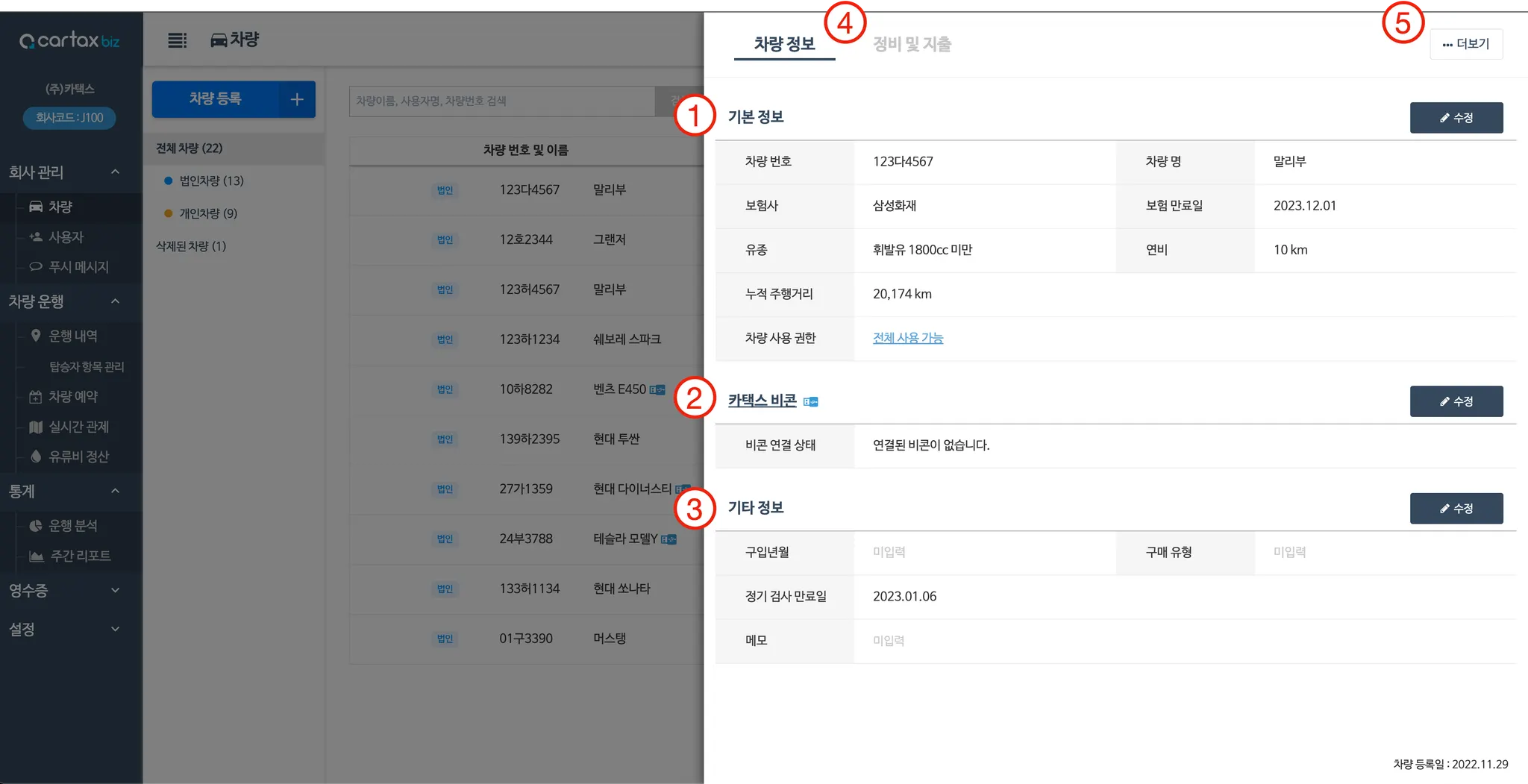 3. 등록 차량 리스트 | 1. 차량 기본 정보: 법인/개인, 차량번호 및 차량명