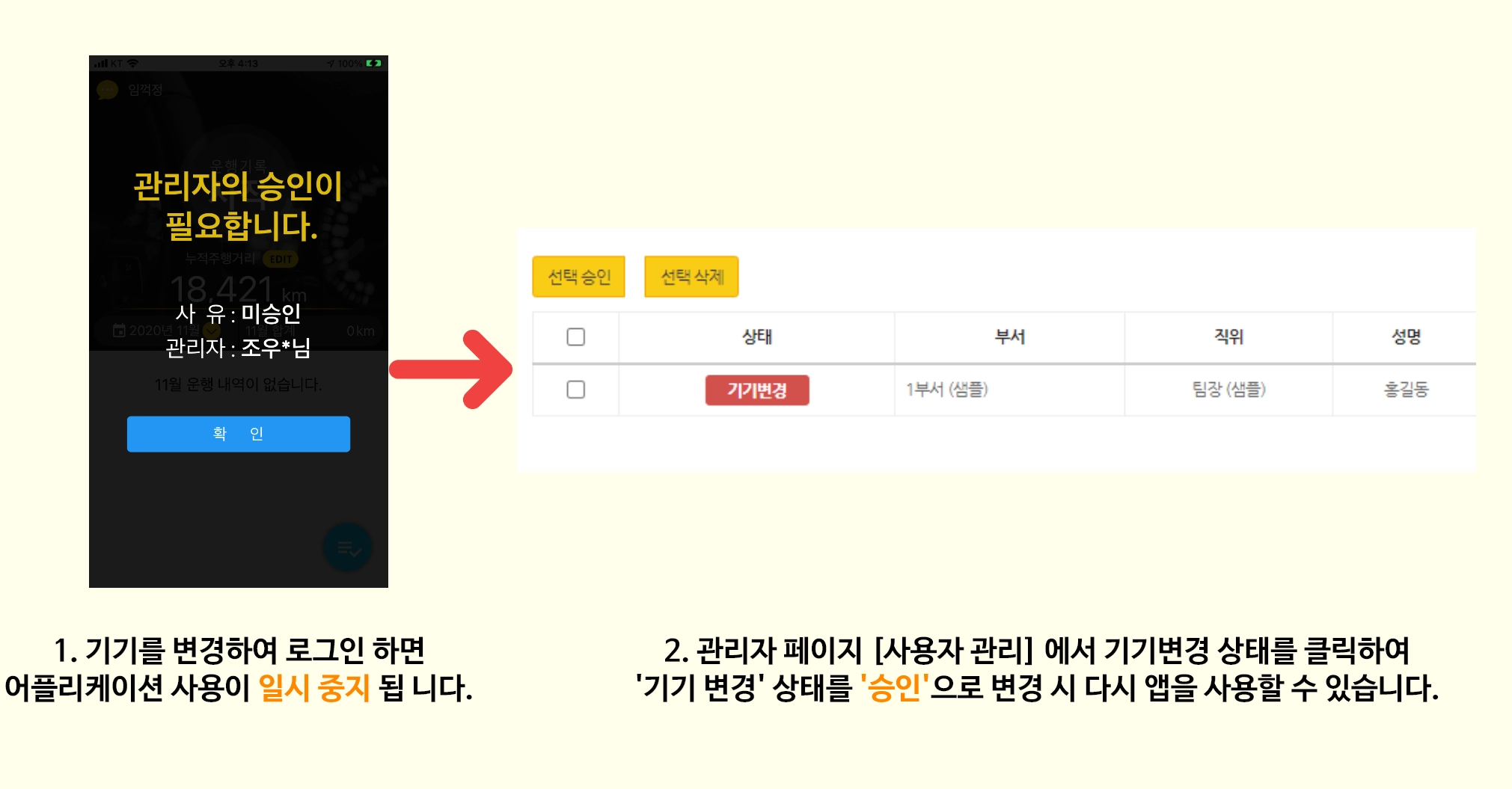 사용자 기기변경 자동승인 을 '승인'으로 설정하면, 기기변경해도 앱 사용 정지되지 않습니다.
