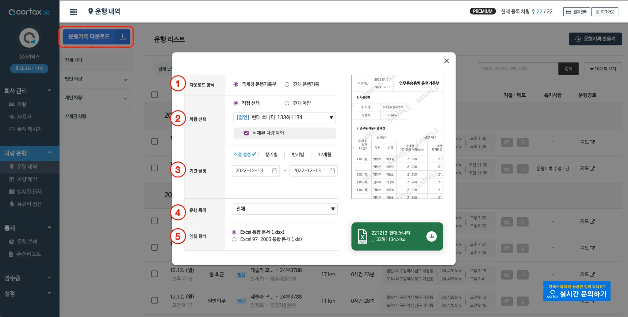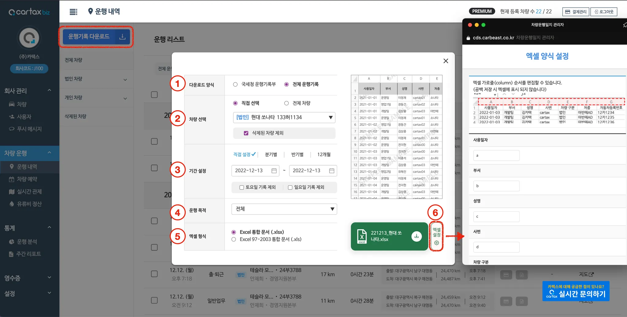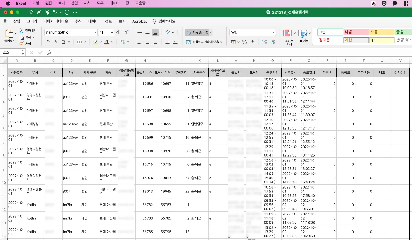 - 국세청 운행기록부에 표기되지 않는 모든 데이터를 엑셀로 내려받습니다. |