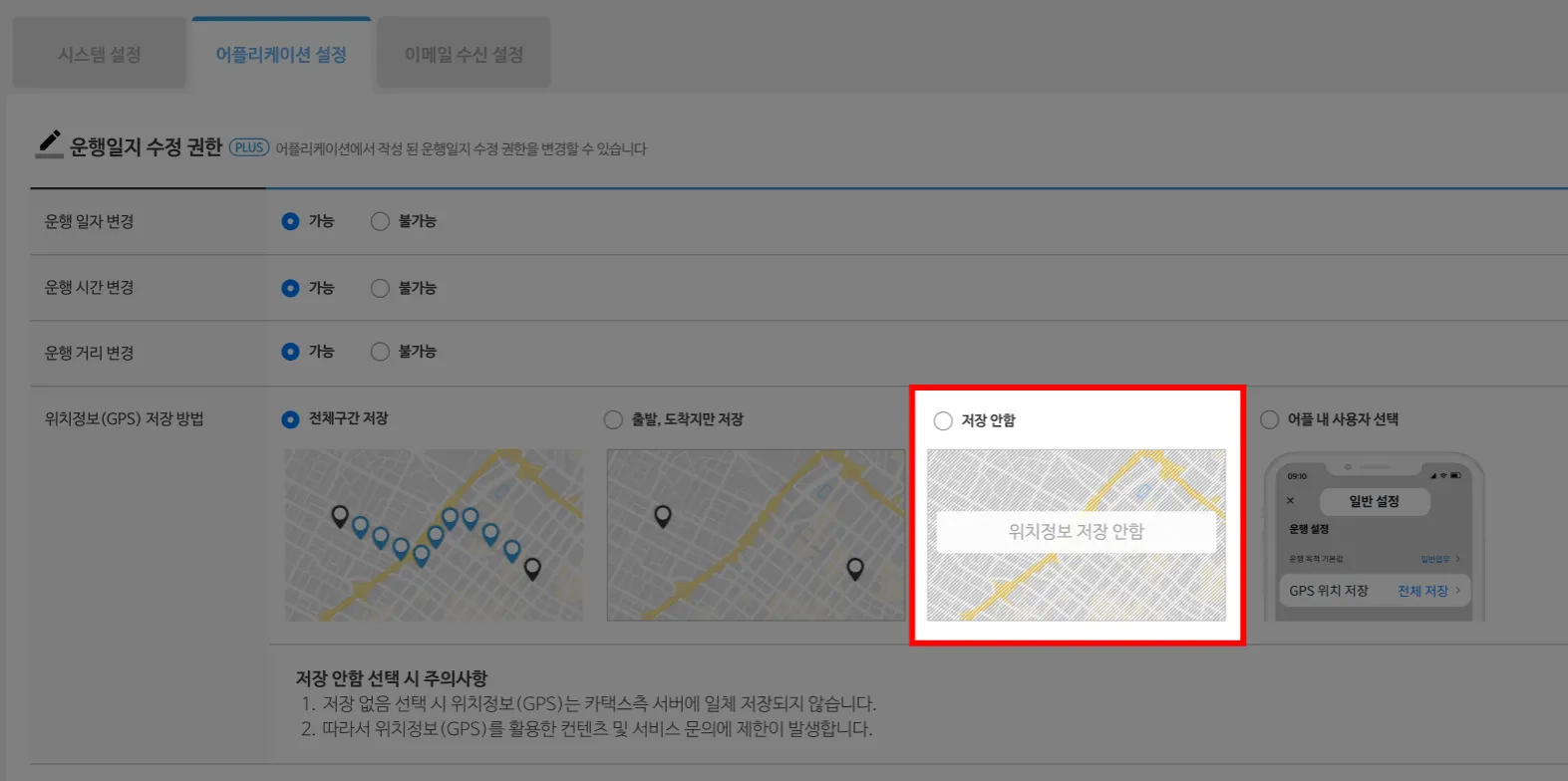 웹 관리자페이지 → 시스템 설정 → 어플리케이션 설정 → 위치정보 저장 방법 ‘저장 안함' 선택 후 저장