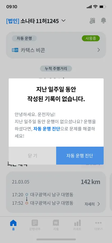 잘못된 자동운행 설정으로 운행기록 누락이 발생한 경우 자동 운행 진단 기능으로 연결되는 팝업을 확인하실 수 있습니다.