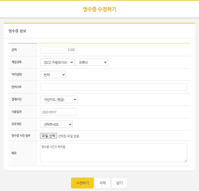 먼저 지출 항목을 선택하면, 영수증 첨부 및 내용을 작성할 수있습니다.
