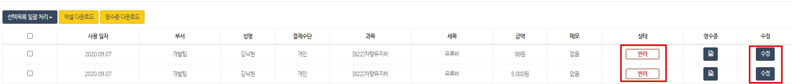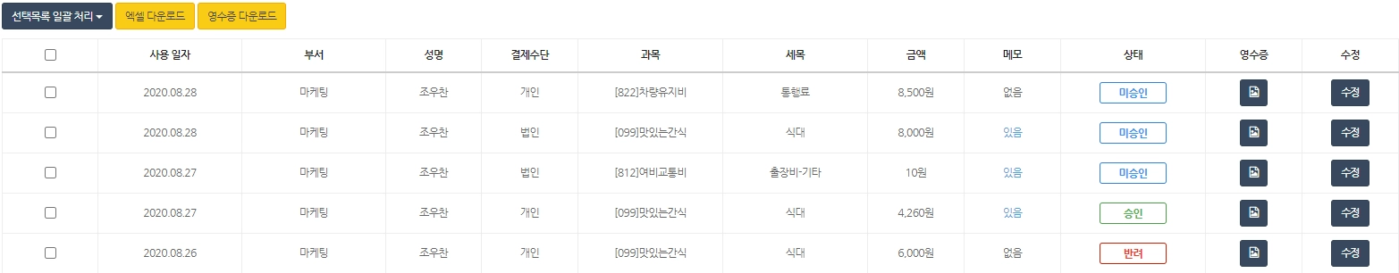 엑셀 다운로드는 승인한 모든 정산내역을 취합하여 다운로드하여 회계처리시 활용가능합니다.