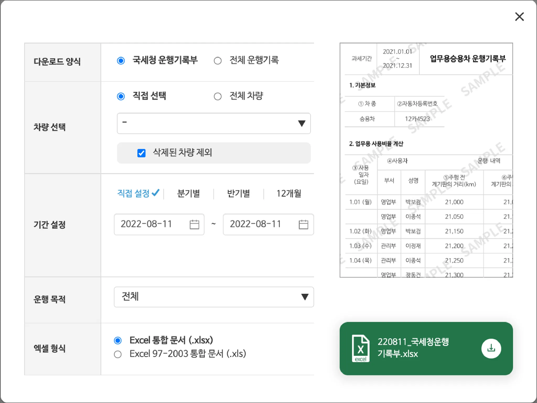 관리자페이지 [차량 운행]메뉴→[운행 내역]페이지→[운행일지 다운로드]버튼→국세청 운행기록부 선택