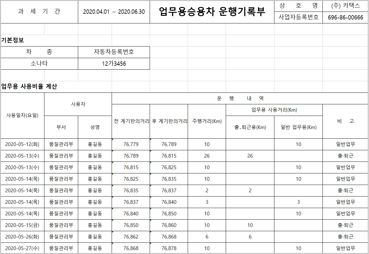 국세청 제출 양식 ‘업무용승용차 운행기록부’(법인차량 운행일지)를 완성된 상태로 다운로드 할 수 있습니다.