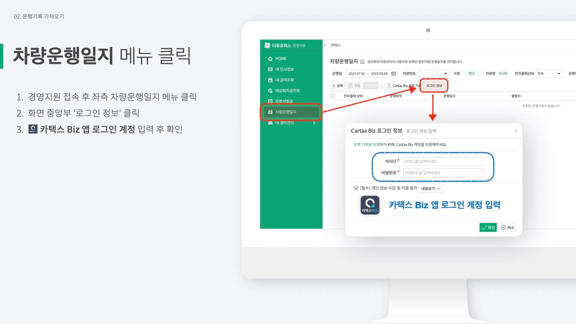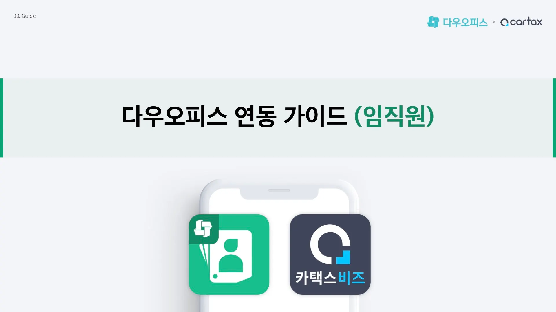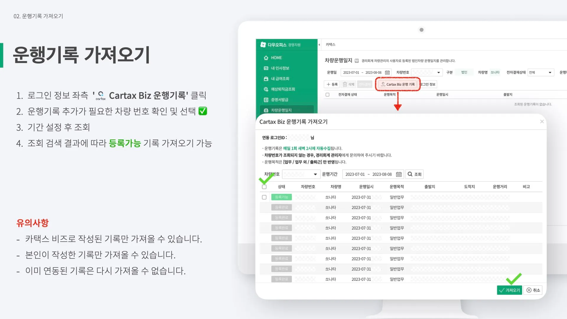 카택스에서 제공하는 API 키를 다우오피스에 등록하여, 각 사용자(임직원)가 카택스에서 작성한 운행기록을 언제든지 확인할 수 있는 기능이 제공됩니다.