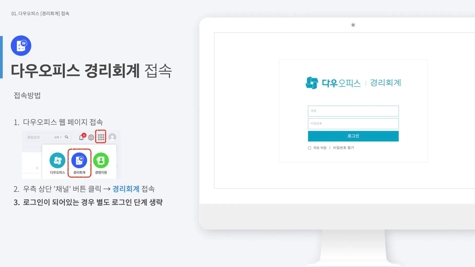 빠르고 편리한 업무 환경을 제공해드리는 다우오피스 답게 연동 과정 또한 정말 쉽고 빠르게 가능합니다.
